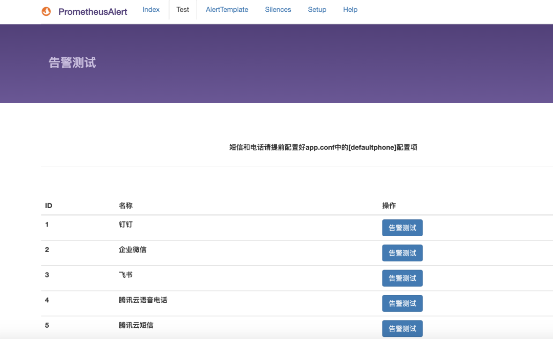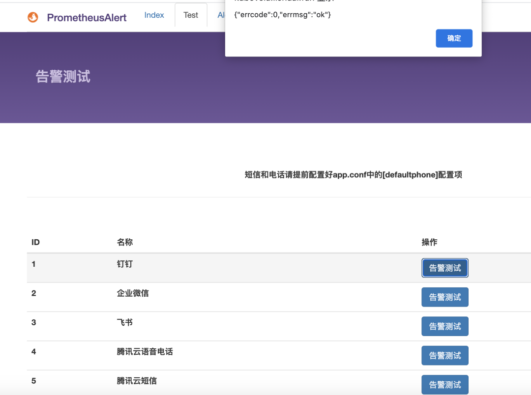 我们可以点击上图的test切换到测试页面,然后点击告警测试即可测试我们配置的报警媒介是否能正常发送告警消息。
