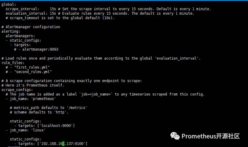 更改prometheus.yml配置文件如下来实现增加对Linux系统监控的功能:
