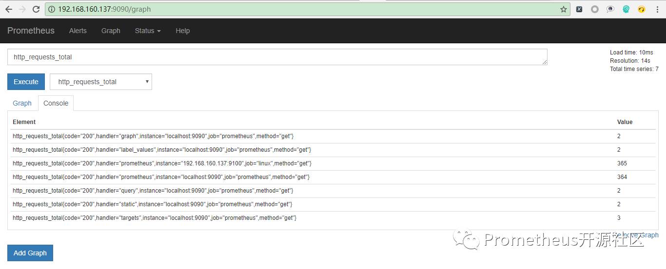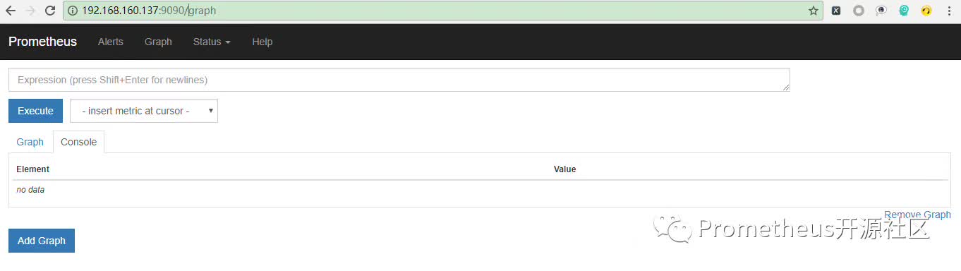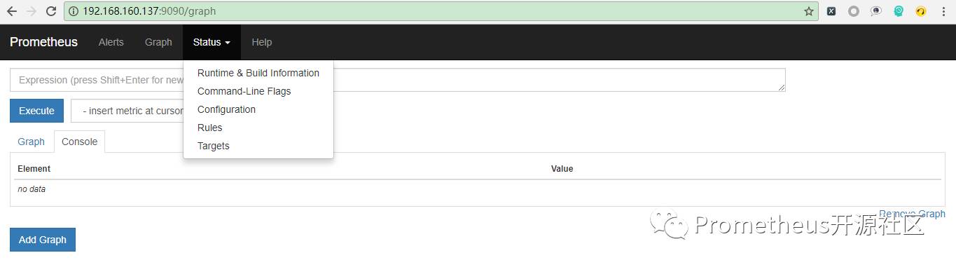 在浏览器输入http://192.168.160.137:9090打开prometheus页面: