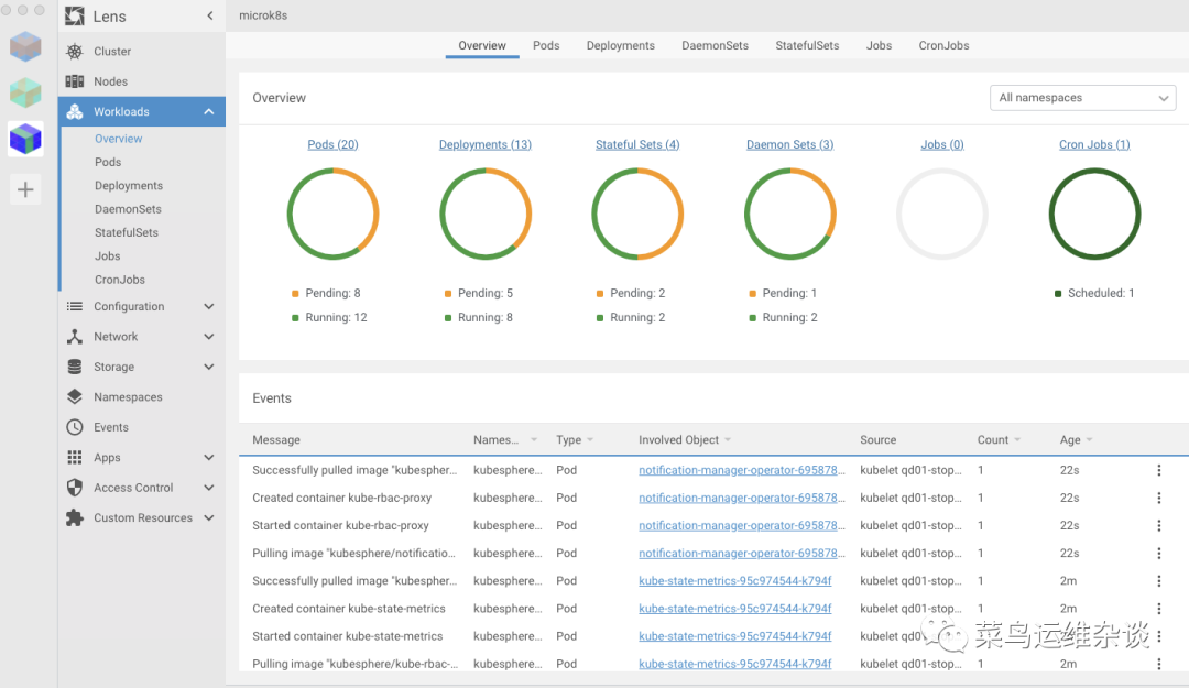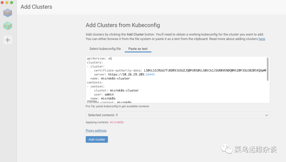 打开lens,添加新集群,把配置文件粘贴进去即可
