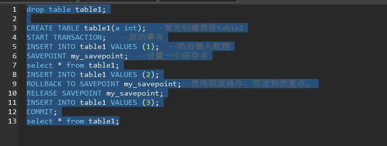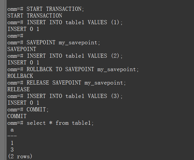 INSERT INTO table1 VALUES (2);ROLLBACK TO SAVEPOINT my_savepoint;--使用回滚操作,回滚到恢复点。z这个 2的数值就没有被插入。