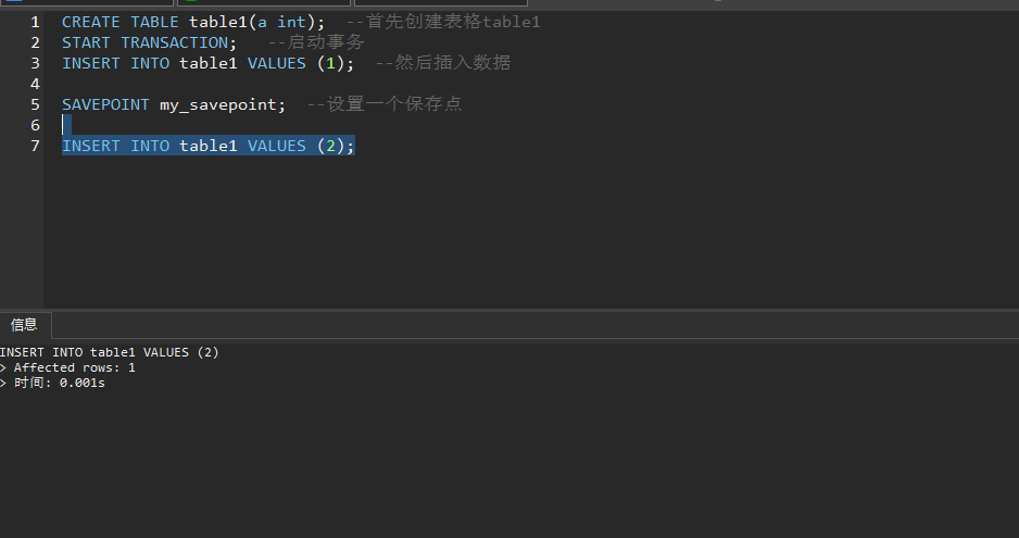 INSERT INTO table1 VALUES (1); --然后插入数据SAVEPOINT my_savepoint; --设置一个保存点这个保存点就是当回滚的时候恢复的位置。