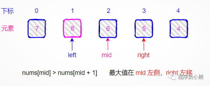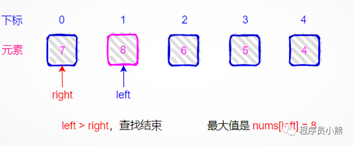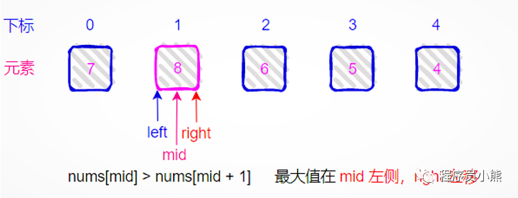 由于数组是先升后降,所以第一个元素或最后一个元素不可能是最大元素,查找区间可设定为[1, numsSize - 2]。