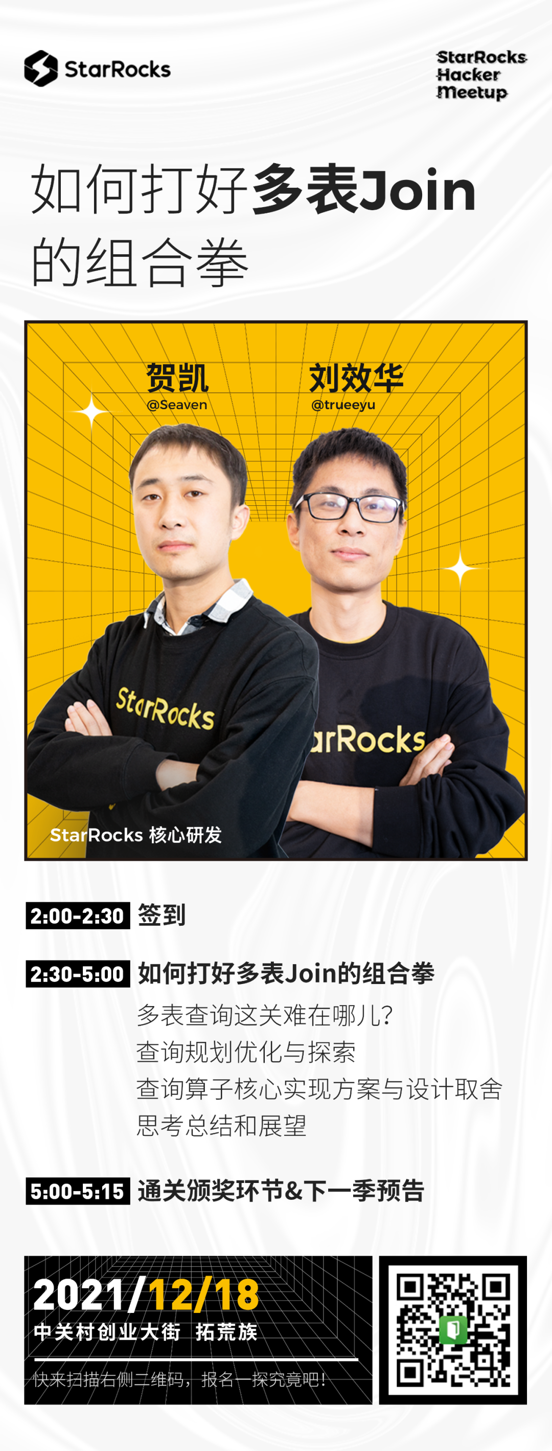 StarRocks Hacker Meetup 是 StarRocks 社区组织的面向开发者的线下活动,旨在通过面对面的交流帮助开发者深入了解 StarRocks 核心功能的实现原理,和开发者共同探讨数据库领域的前沿技术,本季 Meetup 共4期,欢迎持续关注。