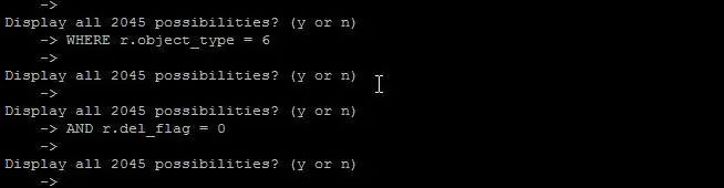 使用Putty访问MySQL数据库服务器,有时候在mysql命令窗口将一些SQL脚本拷贝进去时,你可能会看到一些类似这样的输出信息“Display all 2045 possibilities?(y or n)”,当然可能输出的数字略有不同,不一定是2045,可能是另外一个数字。其实拷贝的SQL语句中是完全没有这些信息的,为什么拷贝时会凭空多出这些信息呢?