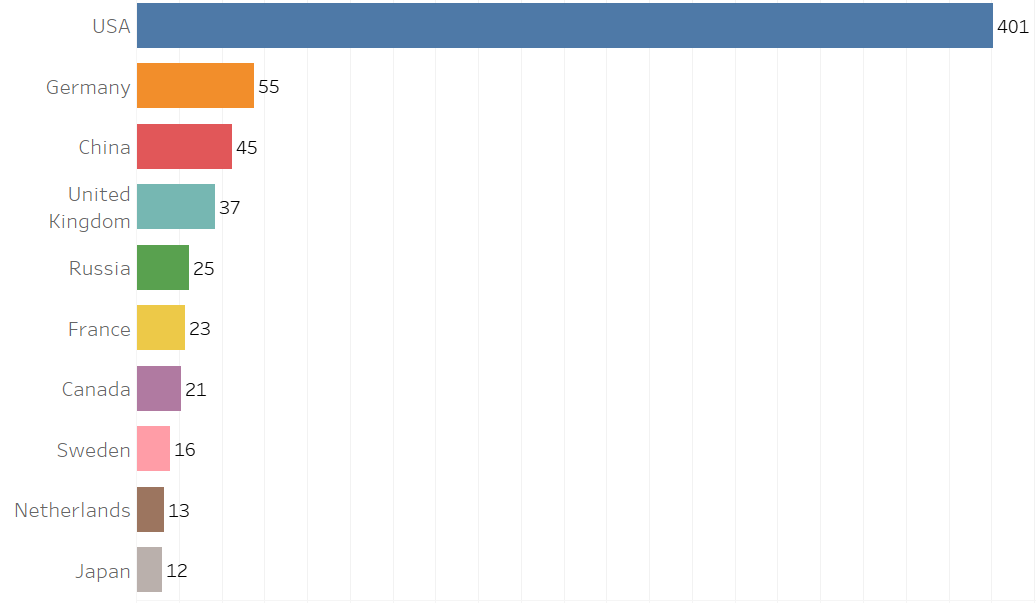 该网站总计收录775种数据库。从国家角度来看,美国占据超过半数的比例,中国共收录有45款产品。较为熟知的产品有TDSQL、GaussDB、TiDB、Oceanbase、GBase、PolarDB、ShardingSphere、SequoiaDB、Kylin、Doris、KunlunDB、RadonDB等,涵盖传统集中式数据库、分布式数据库、数据仓库、云(原生)数据库、数据库中间件形态等多种。但从另一个国内知名三方网站墨天轮收录情况来看,后者收录有189款产品。dbdb.io对中国产品的收录还是偏少,分析其收录对象大多为开源、云或参与到海外的产品,相信是与海外知名度有关。