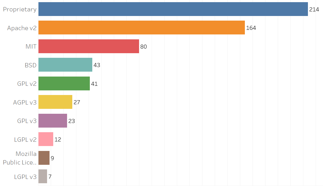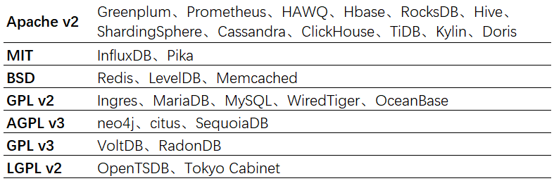 从授权方式来看,商业闭源有214种,占比总体的28%,也就是近3/4的产品是采用开源方式。从下面各开源协议产品来看,Apache、MIT、BSD等较为宽松的协议产品相对较多。下面将主要协议中较为熟悉的产品整理如下,需要说明的是国产数据库产品例如openGauss、OceanBase采用中国推出的开源协议-Mulan。其相较于BSD协议更为宽松和自由。