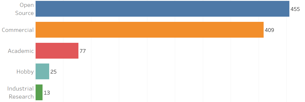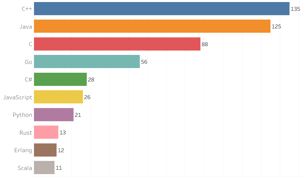 从编程语言来看,C/C++仍然占据主导地位,但Java的表现有些意外。后者在性能方面,一致被人所诟病,但仍然有如此多产品采用Java。此外,Go的表现也不错。