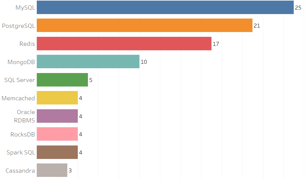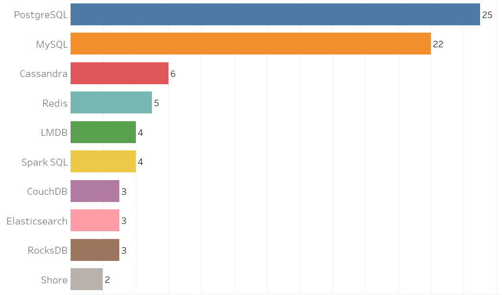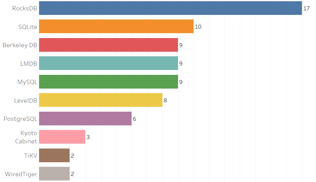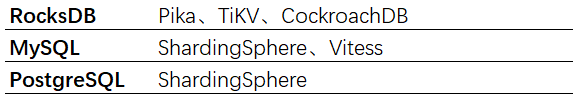 有些数据库产品是嵌入了其他产品。这部分就展示了被内嵌的数据库产品分列。RocksDB作为一款优秀的单机数据库,被嵌入最多。此外,常见的MySQL、PostgreSQL也有被嵌入。这其中ShardingSphere比较特殊,它支持多种底层数据源,因此可嵌入MySQL或者PostgreSQL,都是可以的。