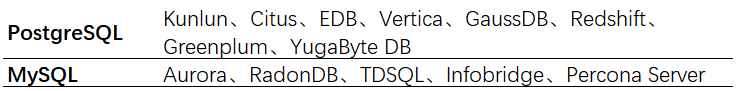 从发展起源来看,仍然是PostgreSQL、MySQL两大开源数据库占比最高。很多数据库产品多是源自这两个产品。下表罗列出比较熟悉的一些产品。
