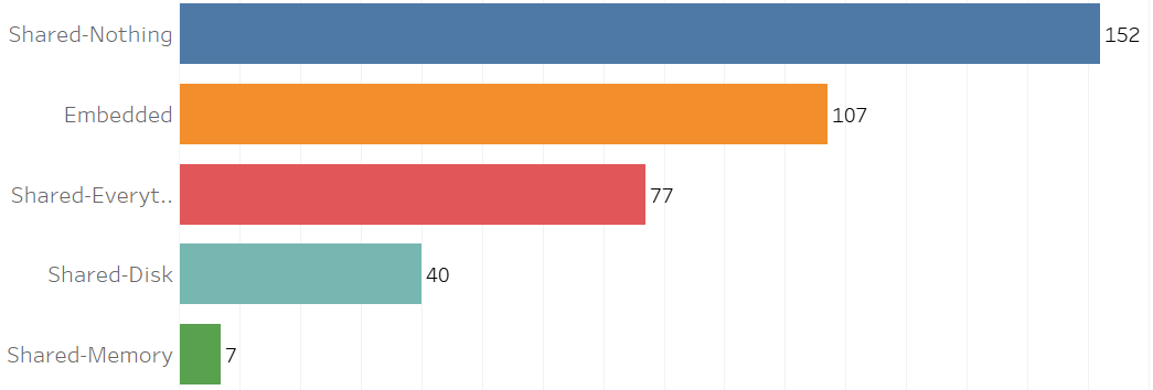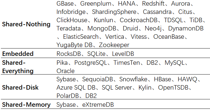 从系统架构来说,数据库经历了从单体-集中-分布式的道路。资源共享层面,也逐步走到shared-nothing的模式居多。从统计数据来看,Shared-Nothing占据了大部分。