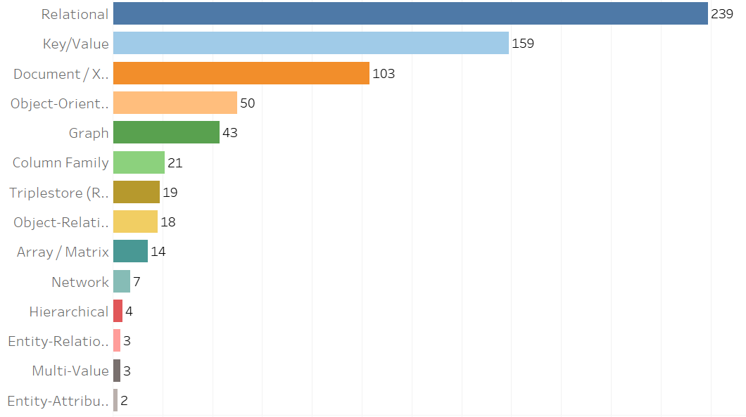 从数据模型来看,关系模型仍然占据着主导地位,键值、文档类型紧随其后。这也是数据库使用的最常见的几类场景。