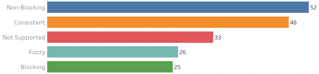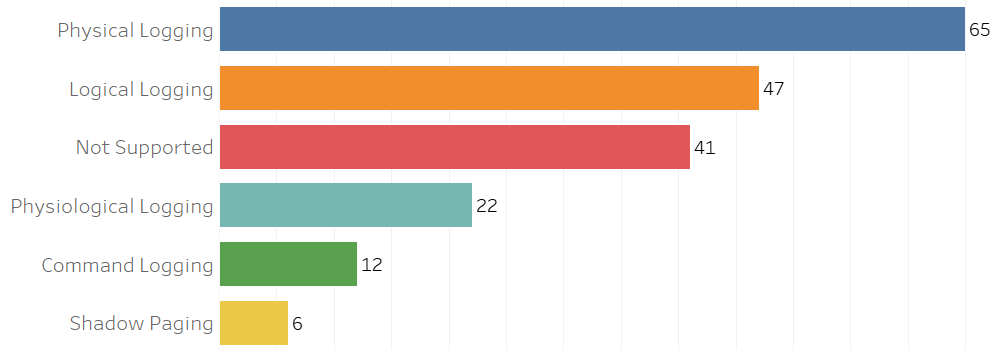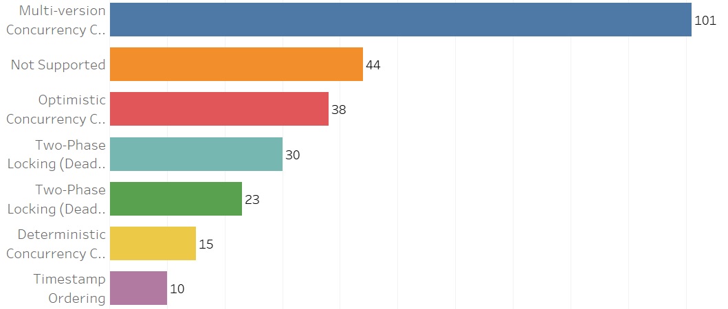 从并发控制来看,多版本并发控制(MVCC)已然成为主流,其他基于乐观并发控制、两阶段锁并发控制也有一些。