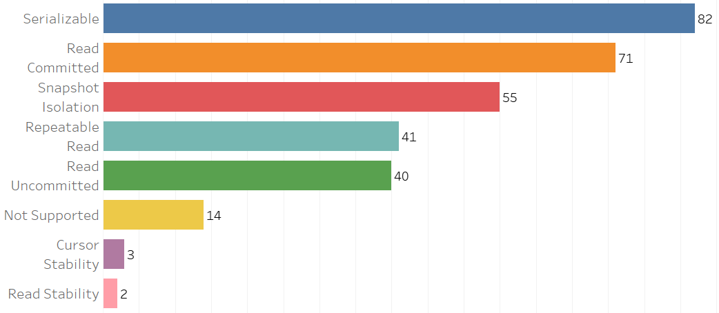 从隔离级别来看,数据库产品一般都会支持多种。最为保守的Serializable支持最为广泛,其次是RC、RR等。