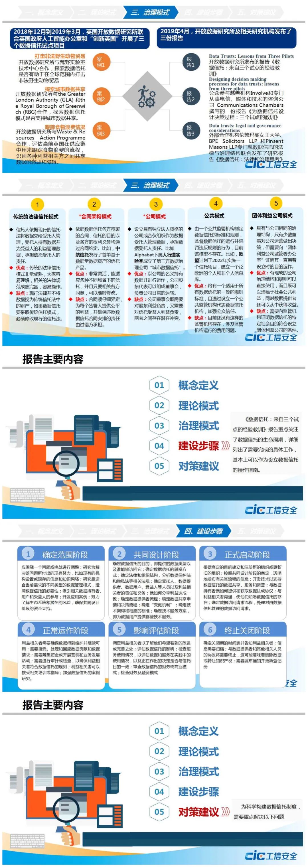 报告指出,建立数据信托的五种方式包括传统的法律信托模式、合同架构模式、公司模式、公共模式和团体利益公司模式。具体来看,设立数据信托需要遵循六大步骤,包括确定数据信托范围、就相关问题达成共识、正式启动、维护正常运作、评估影响、确定终止关闭。