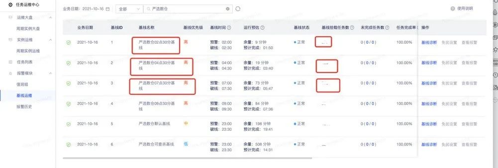 利用网易有数的中台产品:任务运维中心,设置2点半基线->4点半基线->7点半基线,保证核心维表和dwd表、核心dws相关dwd表、核心dm层表及时产出