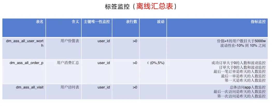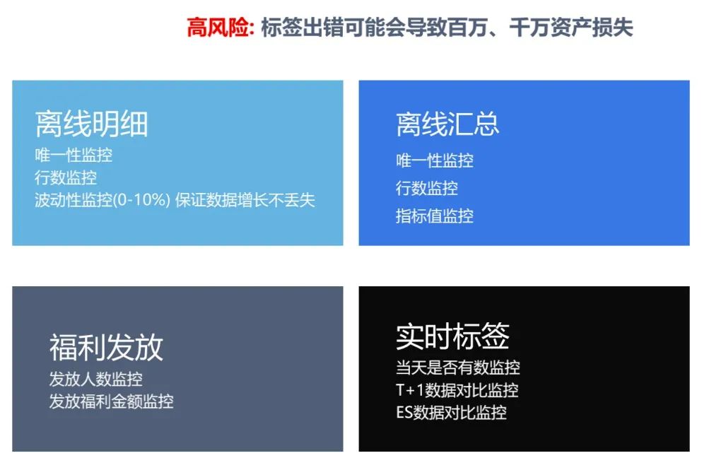 在用户标签这块我们会有实时+离线的dm层明细数据、汇总数据,为了保障标签不带来资损,这块我们也进行了全方位的质量监控(这块类似于dwd 和dws 的数据监控)。