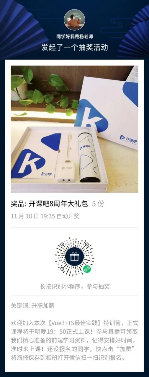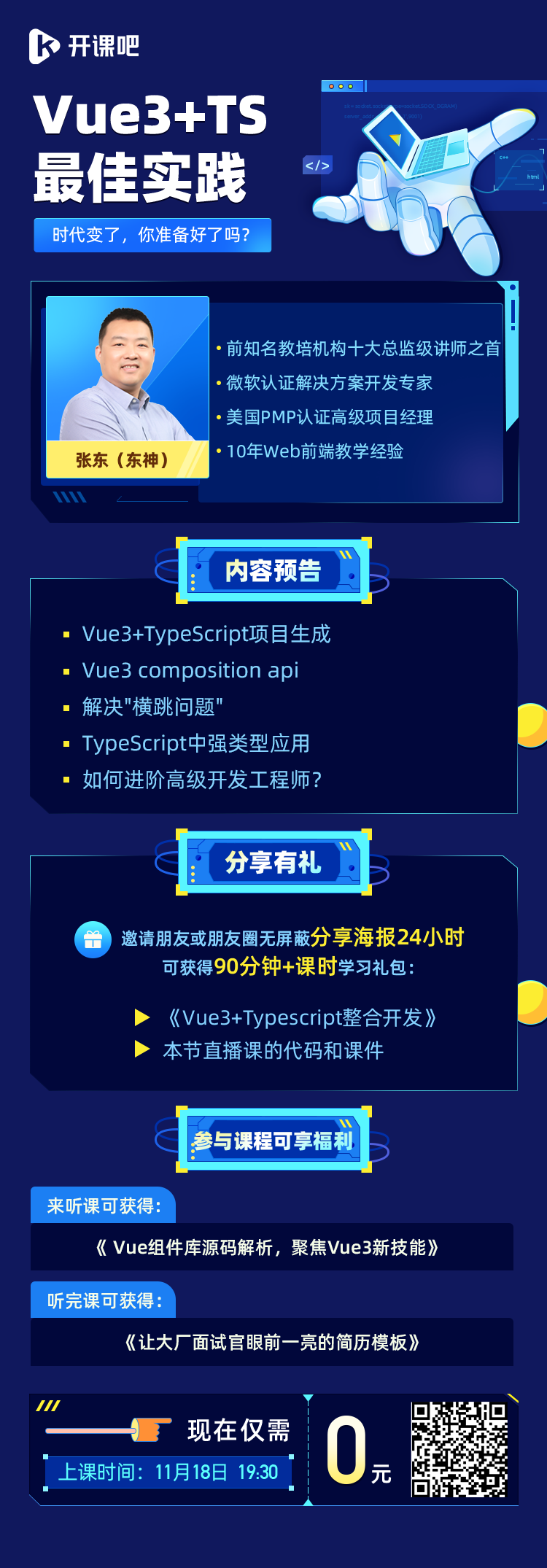 11月18日晚8点有一个0元公开课《Vue3 + TS最佳实践》。