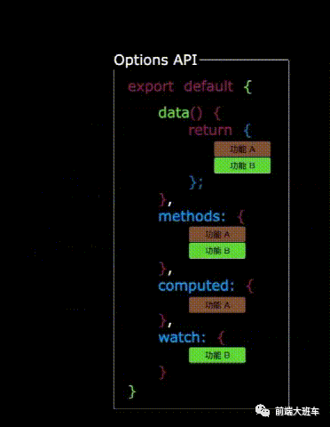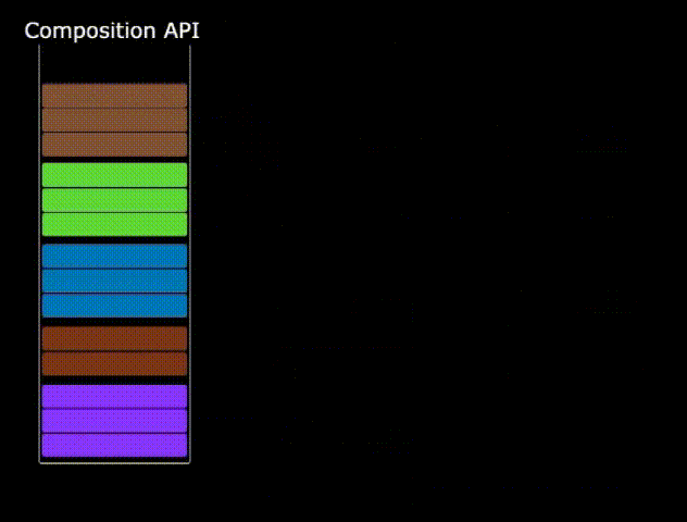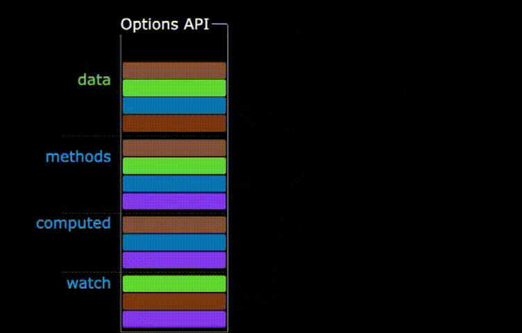 同时,vue3中还为了解决Option API的横跳问题,提供了更优的解决方案——Composition API。Composition API允许我们按功能组织数据和方法。打破了data(){}、methods:{}等固定结构的束缚。基本原理如下所示: