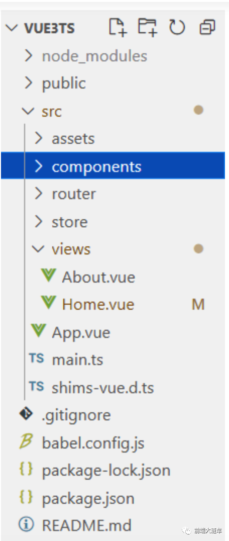 结果,就生成了一套vue3+typescript的脚手架源代码。然后,用visual studio code打开刚刚生成的脚手架文件夹,这里是vue3ts。如下图所示: