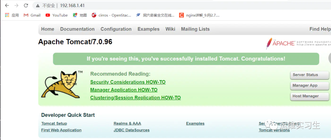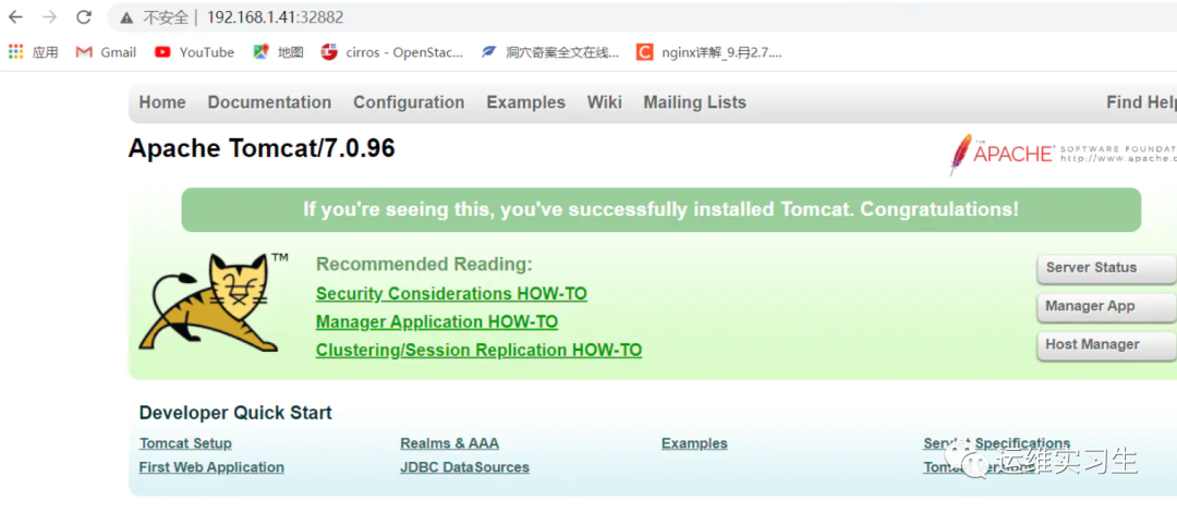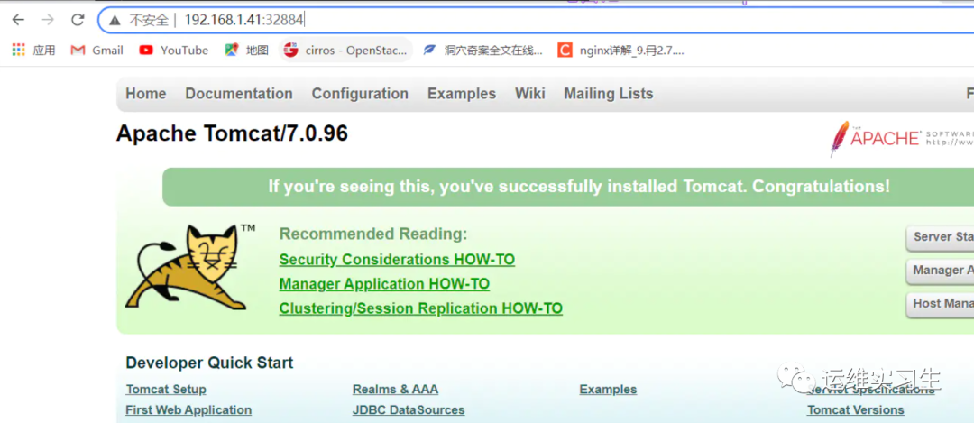 [root@server ~] yum -y install java[root@server local] ls/usr/local/apache-tomcat-7.0.96.tar.gz/usr/local/apache-tomcat-7.0.96.tar.gz[root@server local] tar -zxvfapache-tomcat-7.0.96.tar.gz[root@server local] cd apache-tomcat-7.0.96[root@server apache-tomcat-7.0.96]./bin/startup.sh[root@server apache-tomcat-7.0.96] netstat-ntulp | grep 8080tcp6 0 0 :::8080 :::* LISTEN 9851/java