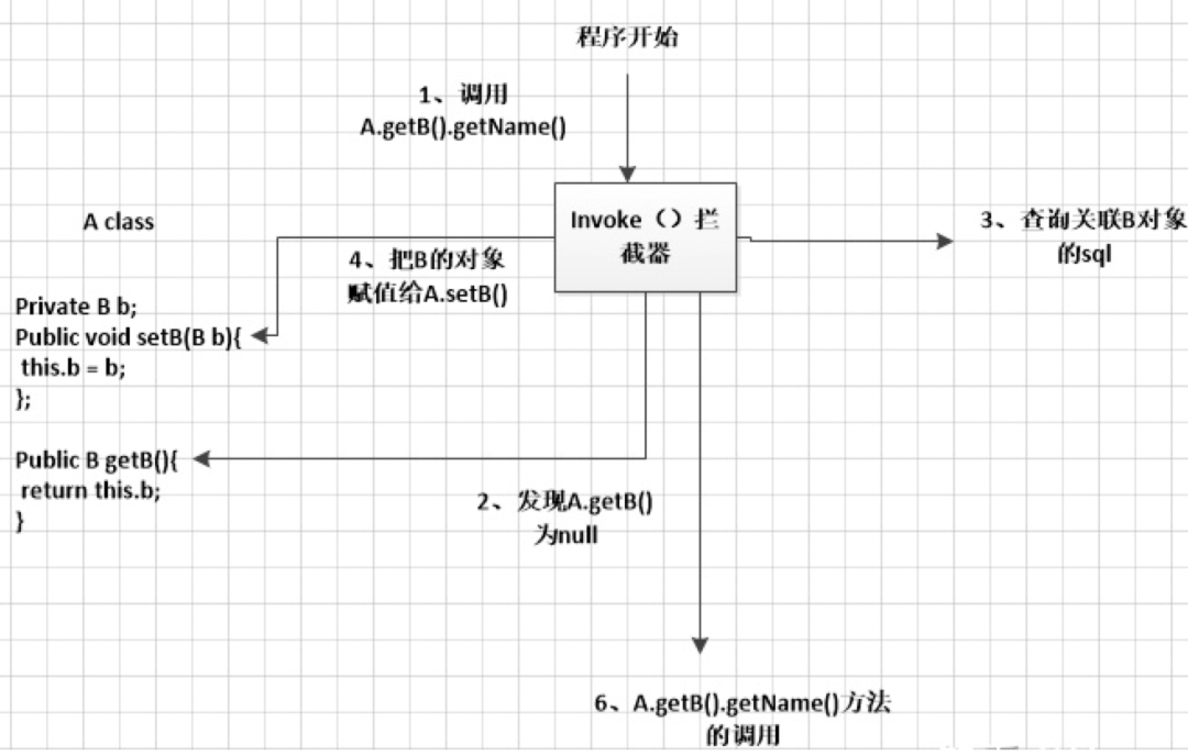 原理:使用CGLIB创建目标对象的代理对象,当调用目标方法时,进入拦截器方法,比如调用A.getB().getName(),拦截器invoke()方法发现A.getB()是null值,那么就会单独发送事先保存好的查询关联B对象的sql,把B查询上来,然后调用A.setB(b),于是a的对象b属性就有值了,接着完成A.getB().getName()方法的调用。这就是延迟加载的基本原理。