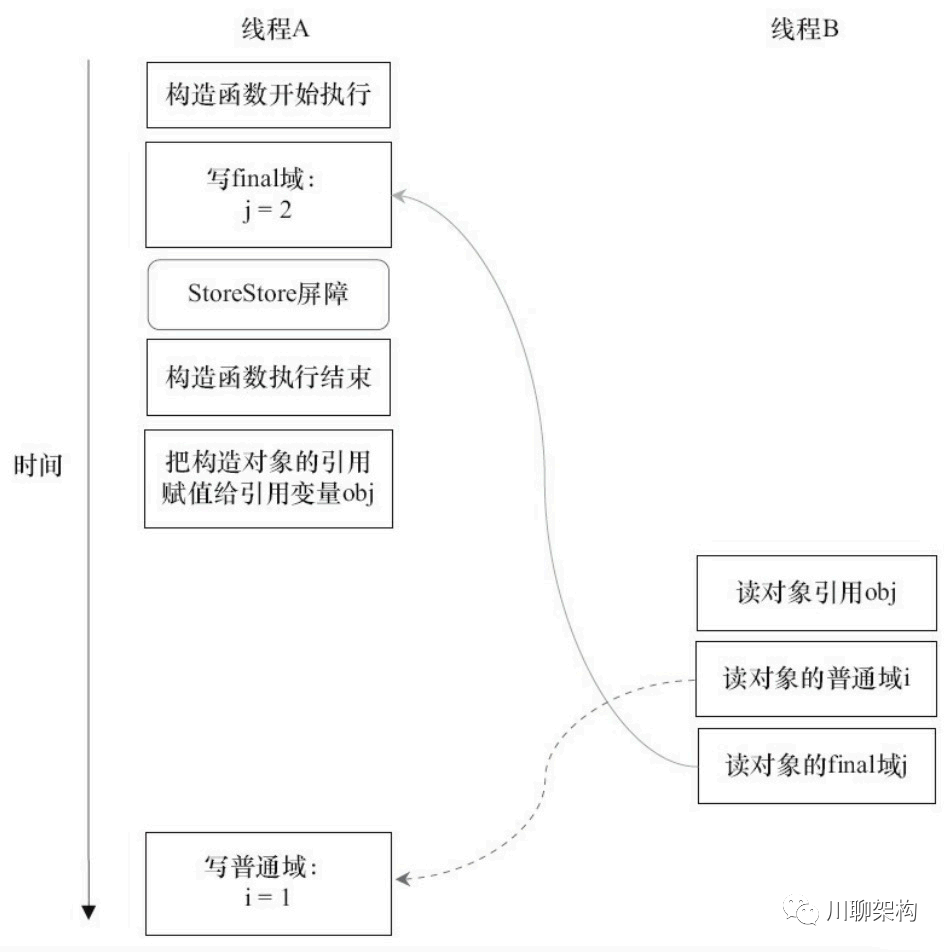 public class FinalExample {int i; // 普通变量final int j; // final变量static FinalExample obj;public FinalExample(){ // 构造函数i = 1; // 写普通域j = 2; // 写final域}public static void writer(){ // 写操作(线程A)obj = new FinalExample();}public static void reader(){ // 读操作(线程B)FinalExample object = obj; // 读对象引用int a = object.i; // 读普通域int b = object.j; // 读final 域}}