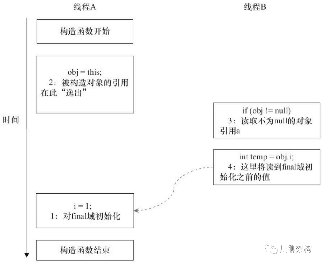 线程A执行writer()方法,线程B执行reader方法。这里的操作2 (this引用在此”逸出”) 使得对象还未完成构造前线程B可见,无法看到final域被初始化后的值。因为这里的操作1 (i=1) 和操作2(obj = this) 之间可能被重排序。