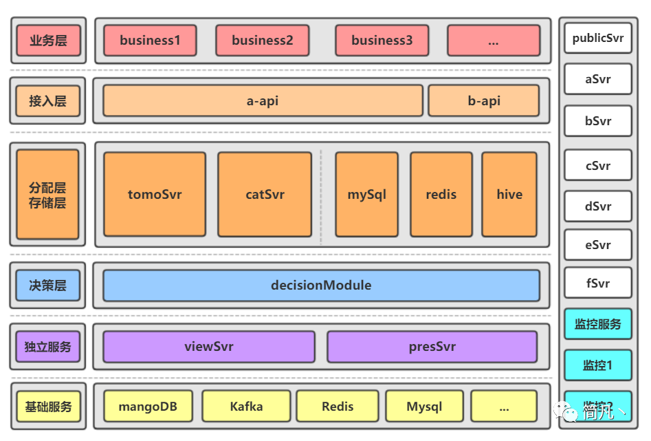 系统架构图往往用于软件研发的总体设计阶段,通过简单分层来展示不同层次的模块,再加上基础服务、公共服务和监控服务等,就构成了系统层面的一个宏观的轮廓。无论是常见的MVC架构、还是DDD架构在整体系统设计层面都是差不多的,一个完整清晰的系统架构图往往会有以下用途: