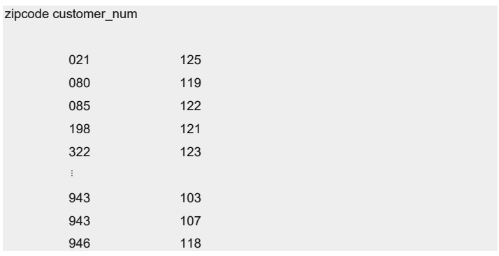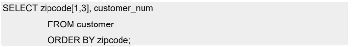 该查询使用子串来选择 zipcode 列的前三个字符(它们标识州)和全部 customer_num,并