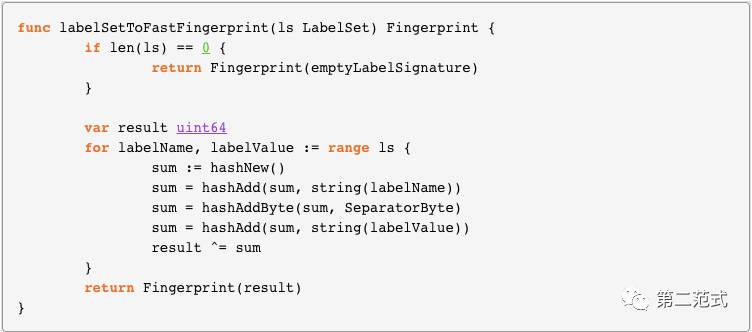那如何才算具有相同 Labels 呢,它的计算逻辑为对一个 map 按照 key 排序,然后依次对 key, value 取值,做 hash 计算,代码逻辑大致为: