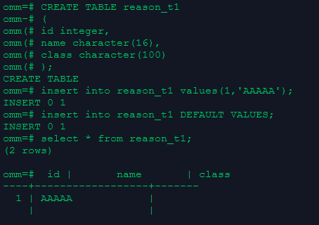 insert into reason_t1 values(1, 'AAAAAAAABAAAAAAA', DEFAULT);–明确整行为缺省值