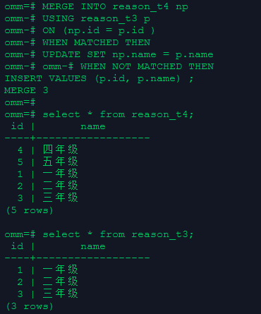 select * from reason_t2;2.使用合并方式更新和插入数据