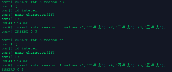 insert into reason_t3 values (1,'一年级'),(2,'二年级'),(3,'三年级');--创建表4