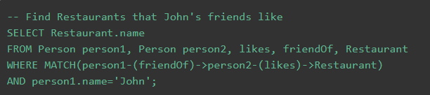 可以看到,上述 T-SQL 片段能够很方便地表达出“John 的朋友喜爱的餐馆”这个包含两种不同连接类型的“二跳式”查询,并且用 ACSII 字符表达的箭头也很好地体现了边的方向性。若与相同语义的传统 SQL 写法相比,这样的表达方式无疑清晰、直观得多。