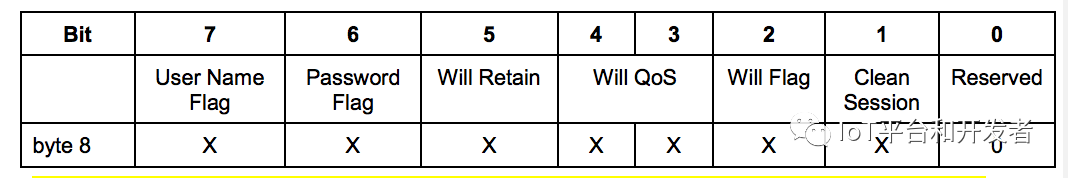 连接标志字节包含一些用于指定MQTT连接行为的参数。它还指出有效载荷中的字段是否存在。