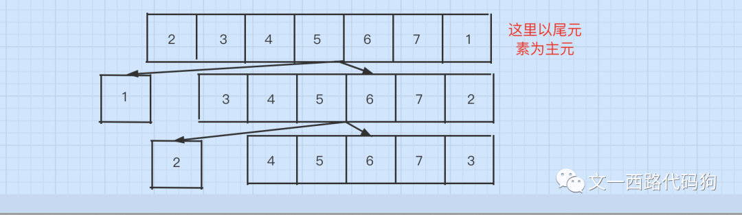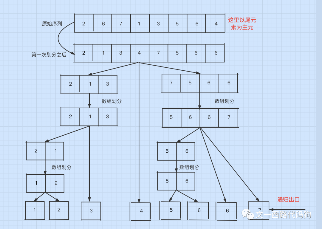 /*** @Date: 2020-03-24* @Description: 快速排序算法(选取一个数为基数 , 比他大的总是在右边 , 小的总是在左边)* @Description: 时间复杂度好的情况下为O(n), 坏的情况下为O(n ^ 2)*/public static void quickSort(int a[], int low, int high) {if (low >= high) {return;}int p = partition(a, low, high);quickSort(a, low, p - 1);quickSort(a, p + 1, high);}public static int partition(int[] a, int low, int high) {int i = low;int j = high;int base = a[low];while (i != j) {while (a[j] >= base && i < j) {j--;}while (a[i] <= base && i < j) {i++;}int temp = a[i];a[i] = a[j];a[j] = temp;}//将a[low] a[i]的值进行交换,因为a[i]始终是比base小的数的最右边的一个数a[low] = a[i];a[i] = base;return i;}