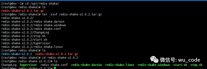 [root@dev ~]# cd /opt/redis-shake/[root@dev redis-shake]# lsredis-shake-v2.0.2.tar.gz[root@dev redis-shake]# tar -zxvf redis-shake-v2.0.2.tar.gzredis-shake-v2.0.2/redis-shake-v2.0.2/redis-shake.darwinredis-shake-v2.0.2/redis-shake.windowsredis-shake-v2.0.2/redis-shake.confredis-shake-v2.0.2/ChangeLogredis-shake-v2.0.2/stop.shredis-shake-v2.0.2/start.shredis-shake-v2.0.2/hypervisorredis-shake-v2.0.2/redis-shake.linux[root@dev redis-shake]# lsredis-shake-v2.0.2 redis-shake-v2.0.2.tar.gz[root@dev redis-shake]# cd redis-shake-v2.0.2[root@dev redis-shake-v2.0.2]# lsChangeLog hypervisor redis-shake.conf redis-shake.darwin redis-shake.linux redis-shake.windows start.sh stop.sh