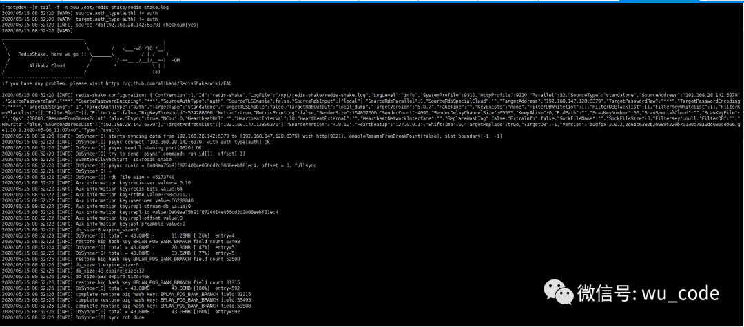 2020/05/15 09:00:29 [INFO] DbSyncer[0] starts syncing data from 192.168.28.142:6379 to [192.168.147.128:6379] with http[9321], enableResumeFromBreakPoint[false], slot boundary[-1, -1]2020/05/15 09:00:29 [INFO] DbSyncer[0] psync connect '192.168.28.142:6379' with auth type[auth] OK!2020/05/15 09:00:29 [INFO] DbSyncer[0] psync send listening port[9320] OK!2020/05/15 09:00:29 [INFO] DbSyncer[0] try to send 'psync' command: run-id[?], offset[-1]2020/05/15 09:00:29 [INFO] Event:FullSyncStart Id:redis-shake2020/05/15 09:00:29 [INFO] DbSyncer[0] psync runid = 0a08aa75b91f8724014e056cd2c3068eebf81ec4, offset = 126, fullsync2020/05/15 09:00:30 [INFO] DbSyncer[0] +2020/05/15 09:00:30 [INFO] DbSyncer[0] rdb file size = 451737482020/05/15 09:00:30 [INFO] Aux information key:redis-ver value:4.0.102020/05/15 09:00:30 [INFO] Aux information key:redis-bits value:642020/05/15 09:00:30 [INFO] Aux information key:ctime value:15895216092020/05/15 09:00:30 [INFO] Aux information key:used-mem value:663048242020/05/15 09:00:30 [INFO] Aux information key:repl-stream-db value:02020/05/15 09:00:30 [INFO] Aux information key:repl-id value:0a08aa75b91f8724014e056cd2c3068eebf81ec42020/05/15 09:00:30 [INFO] Aux information key:repl-offset value:1262020/05/15 09:00:30 [INFO] Aux information key:aof-preamble value:02020/05/15 09:00:30 [INFO] db_size:8 expire_size:02020/05/15 09:00:31 [INFO] DbSyncer[0] total = 43.08MB - 10.87MB [ 25%] entry=0 filter=42020/05/15 09:00:32 [INFO] DbSyncer[0] total = 43.08MB - 21.78MB [ 50%] entry=0 filter=52020/05/15 09:00:33 [INFO] DbSyncer[0] total = 43.08MB - 32.64MB [ 75%] entry=0 filter=52020/05/15 09:00:34 [INFO] DbSyncer[0] total = 43.08MB - 42.92MB [ 99%] entry=0 filter=62020/05/15 09:00:34 [INFO] db_size:1 expire_size:02020/05/15 09:00:34 [INFO] db_size:48 expire_size:122020/05/15 09:00:34 [INFO] db_size:533 expire_size:4682020/05/15 09:00:34 [INFO] DbSyncer[0] total