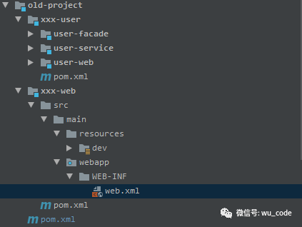 xxx-user模块依托于xxx-web模块运行访问,项目结构图如下