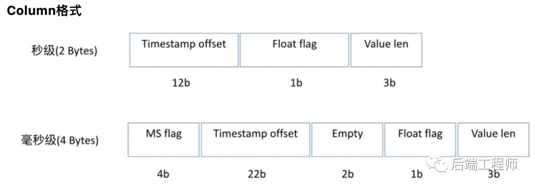这是Column(HBase中称为qualifier)的格式,可以看到毫秒级需要多出2个字节。所以如果你的采集间隔不需要精确到毫秒级别,那请一定使用秒级,可以节省存储空间。Value由于只能存储整数或浮点,所以有一个bit存储Float flag。