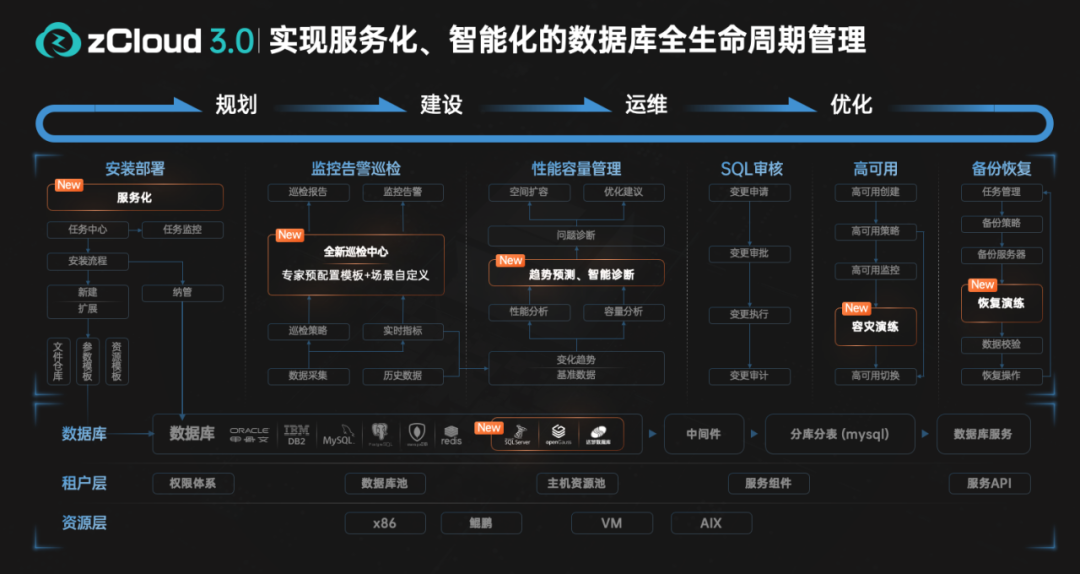 作为生态建设的参与者之一,云和恩墨积极帮助企业在数字化转型、国产化浪潮、业务持续稳健与敏捷等挑战下,建设多元混合数据库场景的最佳解决方案。据巩飞介绍,为应对目前各行业企业用户的共同痛点,帮助用户实现数据库的统一管理,云和恩墨在2021年推出了混合数据库云化管理平台zCloud 3.0版本,实现服务化、智能化的数据库全生命周期管理。