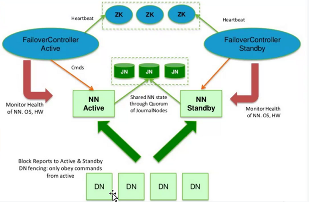 JN:QJM(是JN组成的集群,只有投票,没有存储),JN部署一般和DN在一起,处于同一个节点上,不部署在NN上是因为如果NN挂掉会影响JN进行投票。
