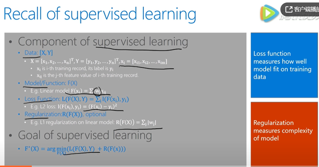 通过调整模型参数w使得损失函数最小化,但一昧的最小化模型输出和数据标度的差异,可能会使得模型过拟合,所以通常加一些正则项来控制模型,比如下图中的L1正则,从而将有监督的学习目标变成了损失函数和正则项的加和。