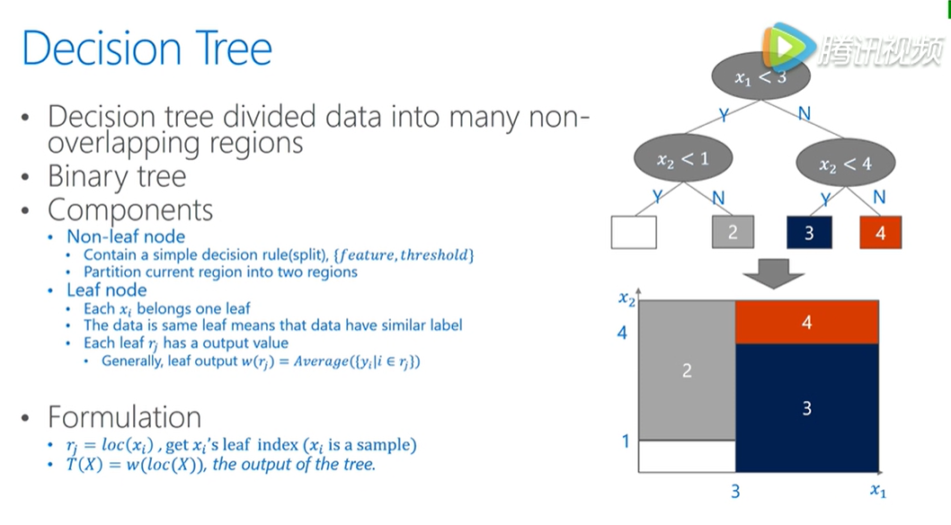 就是把数据的feature value划分成很多不重叠的区域,一般来说我们都是指的二叉树,树种的叶子节点需要做分割。所以会包含分割点信息,有哪个为feature,然后这个为feature,我们用什么将数据分为左边和右边两个部分,从而不断把树长的更深。