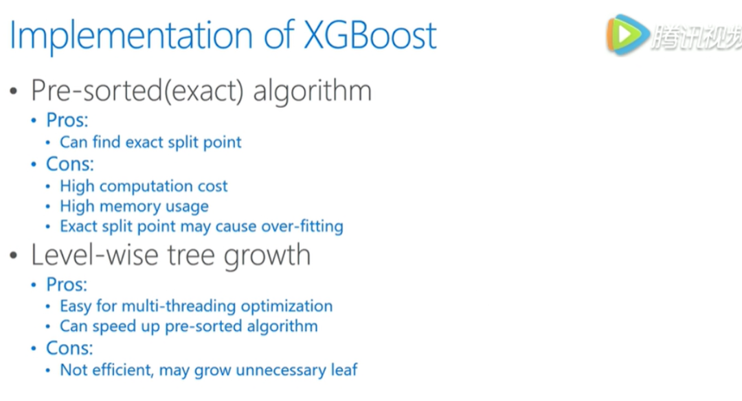 XGBoost是一种基于预排序的方法,它会将每一个unique的feature value做计算,好处是能够找到特定的feature value来做为分割点,不好的地方就是这种方法的计算和存储代价都非常大。并且这样找到的特别精确的分割点可能存在过拟合,另外它生长每颗树的方法是按层生长,即level-wise learning。按层生长会带来不少的时间好处,每一层可以都对所有数据做操作,但是会有一些不必要的运算,比如一些节点不需要分裂计算。