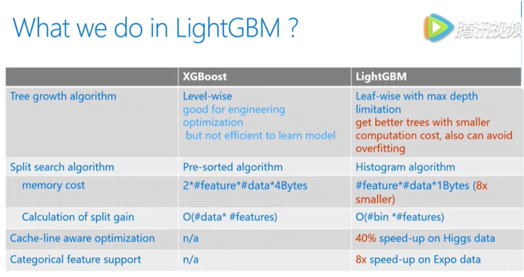 下面表格给出了lgb和xgb之间更加细致的性能对比,包括树的生长,方式,分裂。