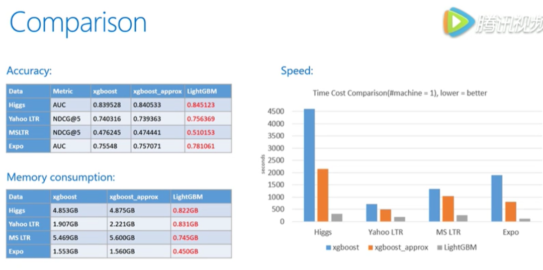 左边对比了应用上的准确率、内存使用情况。其中Higgas、Expo都是分类数据,Yahoo LTR 和 MSLTR 都是排序数据。可以看到lgb在这些数据集上的表现都更好。
