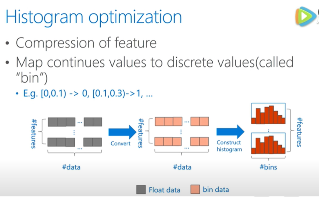 可以看到,这是按照 bin(桶) 来索引 直方图的,所以不需要按照每个 feature 来排序,也不需要一一对比所有不同 feature 值,大大的减少了运算量。