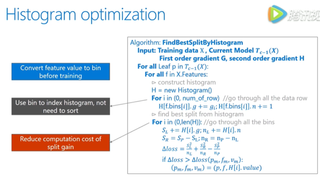 这样一来,数据的表达更为简化,减少了数据的使用,而且直方图带来了一定的正则化的效果,使得我们的模型不容易 over fitting 有着更好的推广性。下面是做过直方图后寻找最佳分裂点的求解函数的伪代码。